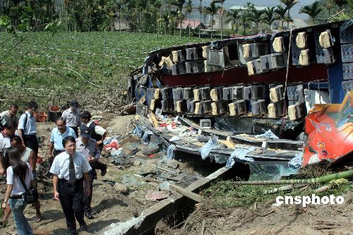 10月3日中午,台湾南投“地检署”人员在肇祸旅游巴前勘察事故现场。该部旅游巴载着十九位大陆游客和一位台湾导游,10月2日晚间途经上述路段遭遇重大车祸,造成六人死亡,十五人轻重伤。当时旅游巴四轮朝天翻覆路旁葡萄园,救助伤员时旅游巴被调为侧卧。中新社发 黄少华 摄