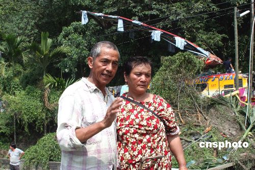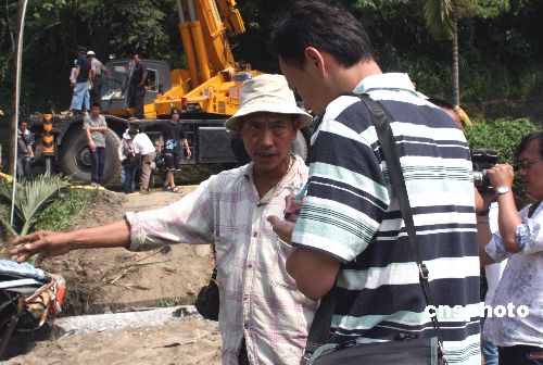 10月3日中午,台湾南投遭遇车祸的旅游巴被吊离信义乡事故现场,家住附近的台湾同胞向媒体讲述他们救助遭遇车祸的大陆同胞经过。该部旅游巴载着十九位大陆游客和一位台湾导游,10月2日晚间途经上述路段遭遇重大车祸,造成六人死亡,十五人轻重伤。中新社发 黄少华 摄