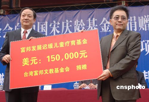 | 十月十二日,台湾富邦产物保险股份有限公司北京代表处首席代表萧明仁(右),在北京宋庆龄故居将一张巨大的十五万美元红色支票,递交给宋庆龄基金会俞贵鳞副主席的手中。这笔款项将注入宋庆龄基金会已经开展的“富邦发展迟缓儿童疗育基金”项目,并帮助“发展迟缓儿童”去回归主流社会。当日,“富邦发展迟缓儿童疗育基金”2006-2007年度项目启动仪式”也同期进行。自二○○一年以来,台湾富邦集团慈善基金会共向中国宋庆龄基金会捐赠六百万元人民币,用于“富邦发展迟缓儿童疗育基金”。中新社发 邹宪 摄