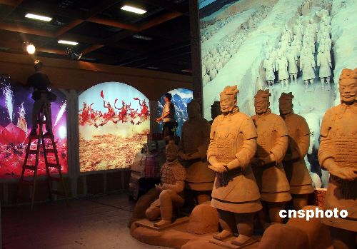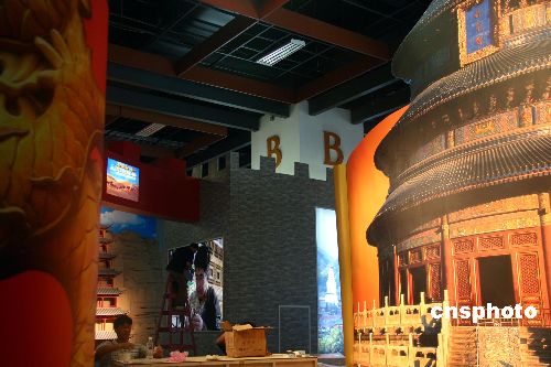 十一月二日,特色浓郁的大陆展场在布展。“第一届海峡两岸台北旅展”即将在台北拉开帷幕,由三十一个省市三百多个单位、四百多位代表组成的大陆参展团已先期抵达台北布展。中新社发 邢利宇 摄