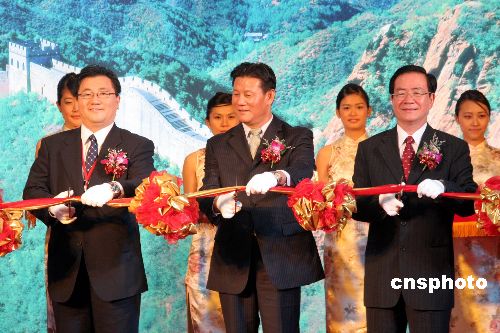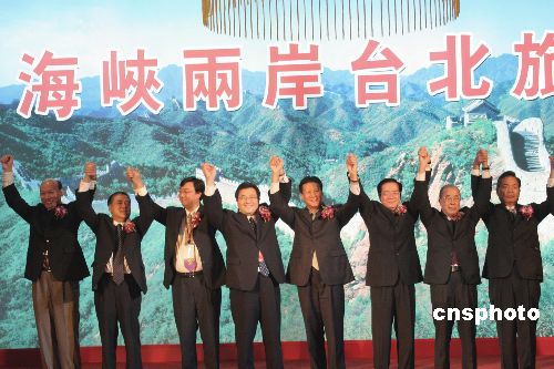 首届“海峡两岸台北旅展”十一月三日上午在台北世贸一馆举行剪彩仪式。两岸旅游界同仁携手,祝贺旅展正式开幕。中新社发 邢利宇 摄