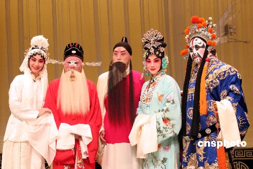 海峡两岸京剧名家联袂演出的“千古官场不如戏‘新老戏’精演”十日将在台北与观众见面。九日在此间召开的记者会上,台湾知名京剧表演艺术家李宝春(中)、青年花旦黄宇琳(左一),以及获得过多项大奖的上海京剧院张派青衣赵群(右二)、铜锤花脸名家杨燕毅(右一)、丑角泰斗孙正阳(左二)等表演了戏曲片断,赢得在场媒体阵阵叫好。中新社发 邢利宇 摄