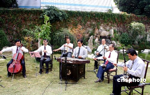 11月13日,由80岁高龄的黄崇量率领的台北中华业余潮乐团一行到东山县进行第十一次艺术交流。 黄崇量是台湾工商界知名人士,业余爱好书画与潮乐,特别是出任台北中华业余潮乐团团长一职后,经常组织潮乐爱好者进行演奏与切磋,这次是他今年第二次组织这种交流,为两岸的文化艺术交流做出了贡献。图为两岸潮乐艺术家在联合演奏。中新社发 朱少文 摄