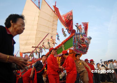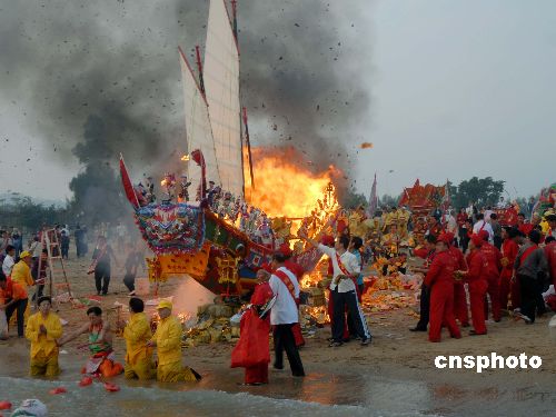 | 11月19日,王船在海边被祭拜后焚烧。厦门港历届规模最大的“送王船”盛典在两岸同胞共同推动下,轰轰烈烈地再次呈现。此盛典由从台湾回厦门老家的阮过水老人主持。经过5天祭祀活动后,一艘长7.36米,真材实料精工细作的特制木船“王船”沿厦门市大学路、海洋三所等被送到曾厝垵圣妈宫旁海边化火焚烧,厦门港渔民借以祈求平安富裕。“送王船”,也称“送王”、“烧王船”,厦门俗称“做好事”,是流行闽台渔港渔村的民间习俗,意在祈求风调雨顺,国泰民安。厦门的 “送王船”习俗,2006年初被公布为福建省级非物质文化遗产。厦门港 “送王船”均由龙珠殿举办,每逢农历闰年进行。1995年恢复中断多年的这项习俗后,今年是第五届。除首届用纸糊船外,其他都是木船。据说,以特制木船在陆地上“送王船”,是公认的最高形式。中新社发 杨戈 摄