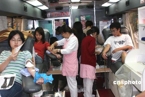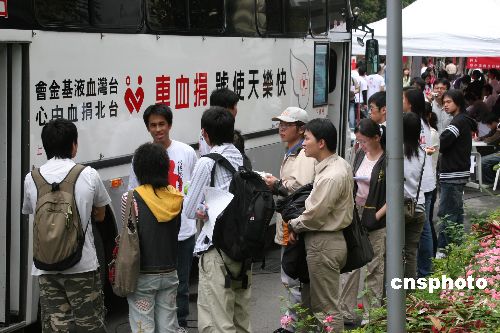 台中市长胡志强夫人邵晓铃日前遭遇车祸,抢救中一日即需输血万余CC,而全台湾目前可用血的库存最多仅能满足一周之用。台湾大学的学生闻讯于十一月二十三日发起献血活动,参加者十分踊跃。中新社发 耿军 摄