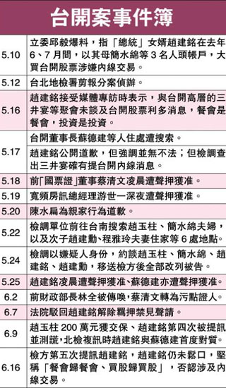 据“中央社”报道,台北“地检署”今年7月间侦结台开内线交易案,依违反“证交法”等罪嫌,起诉7人,被告分别为赵玉柱及赵建铭父子、前国票金董事蔡清文、宽带房讯总经理游世一、前台开公司董事长苏德建、大众联合公司负责人陈镜尧及博通社公司负责人洪敏森。