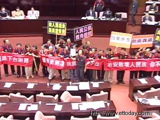 中新网9月19日电 台“立法院”今日(19日)开议第一天很不平静。“行政院长”苏贞昌19日率“阁员”到“立法院”进行施政报告时,在野党紧咬“贪腐”、“治安跳票”、“街头运运失序”等议题,占据议场,高喊“陈水扁下台”,杯葛苏贞昌上台报告。而民进党“立委”也不甘示弱,高分贝回以“马英九下台”。