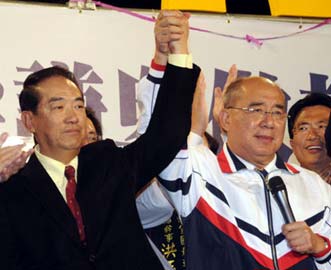 3月22日,台湾举行大选投票,结果中国国民党候选人马英九、萧万长以221万票领先优势获胜,当晚大批支持者在马萧竞选总部前集会欢庆。图为中国国民党主席吴伯雄(前右2)在集会现场表示此次选战得到亲民党得支持,不久的将来可能合并,亲民党主席宋楚瑜(前右3)也到现场欢庆。 中新社发 黄少华 摄