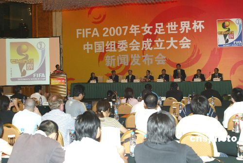 FIFA2007年女足世界杯将于明年9月在中国的上海、天津、杭州、武汉、成都五城市举行,中国组委会30日在北京成立并举行新闻发布会。中新社发 赵振清 摄