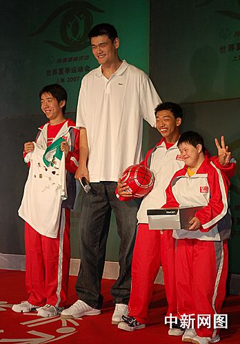 7月21日,2007年世界特殊奥林匹克运动会形象大使姚明,在北京与特奥宣传片的三位主角、特奥会运动员首次与公众见面。推广特奥会公益宣传电视广告片“赵曾曾跑步篇”、“吴方淼篮球篇”和“王守栋乒乓篇”。作者 潘旭临