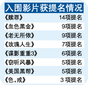 被喻为“英国奥斯卡”的2008年英国影视艺术文化学院颁奖礼(BAFTA),前日公布提名名单,《色,戒》报名角逐最佳电影、导演及女主角等11个项目,结果除了较早前公布入围最佳新人(汤唯)和外语片之外,只有最佳服装设计(朴若木)能获提名;而凯拉·奈特利主演的《赎罪》,则获得本届最多14项提名,成为大热之选。