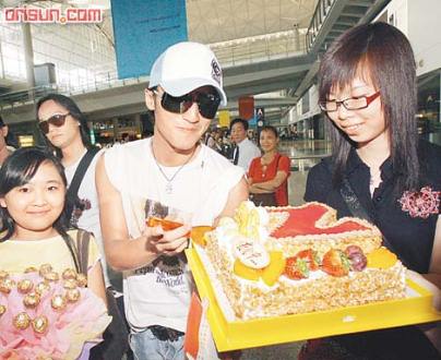 据香港《太阳报》报道,谢霆锋昨日26岁生日,日前他在齐齐哈尔出席完代言的汽水活动,昨午四时再从北京返港。适逢生日,加上有十多位Fans捧着蛋糕和礼物到机场接机,戴上“CC帽”的谢霆锋心情显得特别轻松,Fans以见他出闸门便送上生日祝福,又即场唱生日歌和切蛋糕,当寿星许下愿望和吹蜡烛后,Fans便送上亲手制的朱古力花球,场面热闹。