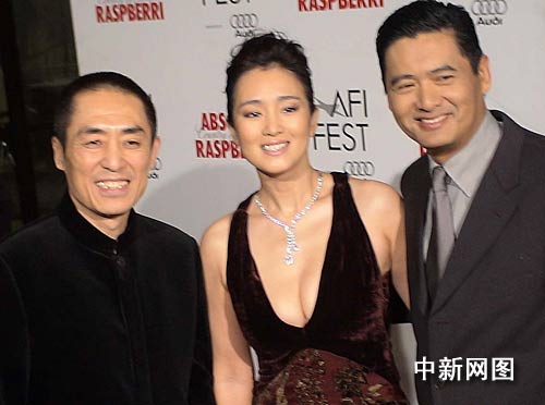 中国著名电影导演张艺谋和当红影星巩俐及香港影星周润发,在第20届美国电影学会电影节闭幕式隆重献演《满城尽带黄金甲》红地毯喜相逢。贾国荣 摄