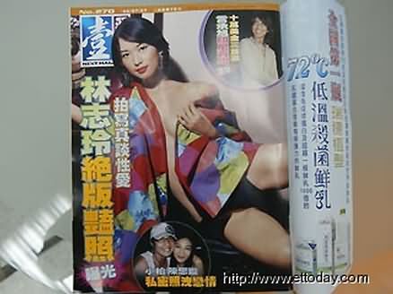 林志玲半裸上身,只围了彩色披肩,下半身也只穿了黑色三角安全裤,姿势引人遐想。一张白色上衣露出D奶,一手拨弄头发,性感妖媚,还有侧身镜头,半露酥胸再加上眼神挑逗,和她现在清纯甜美形象,简直无法联想。不过这已经是2年前,也就是2004年,她还没爆红时拍的性感写真影带。