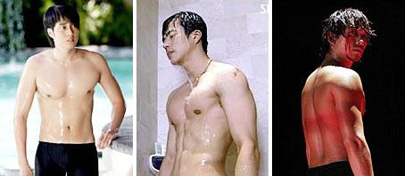 男演员最容易裸露的舞台就是作品中的沐浴戏和游泳戏。李成宰在电视剧《比天国陌生》播放初期,展现了自己王字型的腹肌,从而成为决定该剧成功的关键一步;《菜鸟上班族》中的吴志浩也通过播放初期的沐浴戏确认了自己模特出身的完美身材。