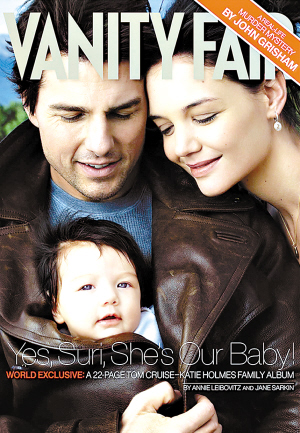 《名利场》杂志前日报道,在汤姆·克鲁斯的寓所里,美国摄影家安妮·莱布维茨为《名利场》杂志独家拍摄了汤姆·克鲁斯、凯蒂·霍尔姆斯和他们的女儿苏瑞的照片,并在最新一期杂志封面上公开。才四个半月大的苏瑞相貌清秀可爱,黑发浓密,集中了克鲁斯与霍尔姆斯的脸部特征。但是照片公开后,马上又有新的质疑声传出——苏瑞为何长得像亚洲人?苏瑞是不是汤姆·克鲁斯和凯蒂·霍尔姆斯的亲生女儿?