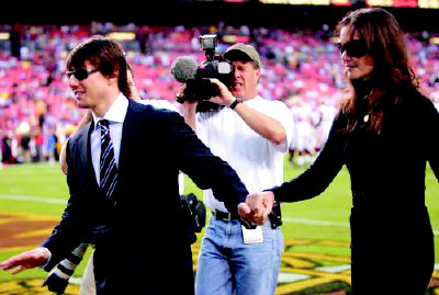 9月11日,美国,汤姆·克鲁斯和未婚妻凯蒂·赫尔姆斯一起现身赛场观看比赛,阿汤哥戴着墨镜酷味十足,当妈之后鲜少露面的凯蒂笑容灿烂,一脸幸福。二人十指紧扣,尽显恩爱。(温文)