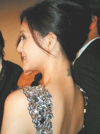 中新网9月27日电 据《民生报》报道,气质典雅的大S,却对刺青很迷恋。昨晚以一袭高贵的低胸礼服现身台北,玉颈后的正方型刺青清晰可见。
