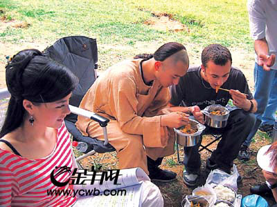 正在武夷山探班的记者,曾多次在片场见到这个被黄晓明称为“小妈”的“富婆”,第一次见面时曾和她有过短暂的聊天。记者得知,“小妈”是黄晓明官方影迷会的成员之一,据说还是香港分会的负责人。“小妈”说自己和黄晓明同姓,是广州人,丈夫在广州做会计,她则因为儿子到洛杉矶UCLA读大学,三年前移民美国给儿子陪读。为了让黄晓明吃得好一点,她自费贴钱包起了黄晓明的三餐。每到开饭的时候,她就会端出鲍鱼汤之类的东西,相比起其他演员来说,黄晓明的伙食是好些,但也好得有限。