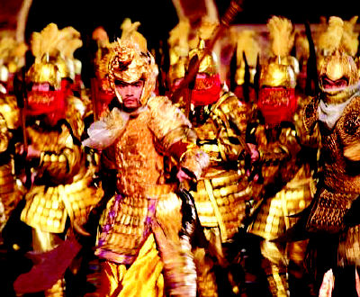 首先是“黄金甲”。一万人齐刷刷穿上了金灿灿的黄金甲,这种效果如何达到?老谋子说,就是用硬纸板、布做底,然后上面贴铜的、铝的金属片,镀上铬发光,最后还要进行旧化处理……