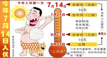 三伏天是按照我国古代的“干支纪日法”确定的。每年夏至以后第三个庚日(指干支纪日中带有“庚”字的日子)为初伏,第四个庚日为中伏,立秋后第一个庚日为末伏,合起来称为三伏。按阳历计算则出现在7月中旬到8月中旬。此时我国大部地区是一年中最热的时节……
