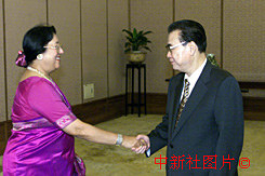 中国全国人大常委会委员长李鹏,7月7日在北京人民大会堂会见各国议会联盟理事会主席赫普图拉。中新社记者:毛建军 摄