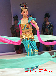 由中国国务院文化部筹办、8月至9月将到美国表演的“2000中华文化美国行”中国服装服饰展演,13日晚在北京远洋大厦预演。图为《历代服饰》主题中的唐代舞装表演。