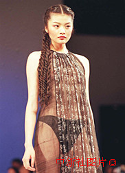 日前在北京远洋大厦举行“2000中华文化美国行”中国服饰预演上,模特展示一款设计新颖的现代时装。中新社记者:邹宪 摄