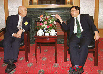辽宁省委副书记张行湘八月五日晚在沈阳市辽宁宾馆会见了台湾“促进中国现代化学术研究基金会”董事长王升(左)夫妇及其随行人员,并一起共进了晚餐。中新社记者 赵振清 摄