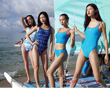 参加“2000世界精英模特大赛中国选拔赛”的女模特,8月12日在海南省三亚市海上拍外景。中新社记者:钱兴强 摄