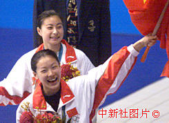 中国女子跳水选手伏明霞、郭晶晶二十八日在悉尼奥运会三米跳板比赛中分别获得金牌和银牌后,挥舞五星红旗向观众致意。中新社传真 李刚 摄