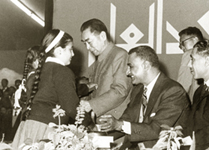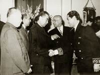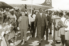 周恩来总理非洲之行 2000年10月10日 14:28 ![]() 1963年12月3日至1964年2月26日,周恩来总理和陈毅副总理兼外长先后访问了阿拉伯联合共和国(今埃及)、阿尔及利亚、摩洛哥、突尼斯、加纳、马里、几 内亚、苏丹、埃塞俄比亚和索马里等十个非洲国家及一些亚洲国家。图为周恩来总理访问阿联时同纳赛尔总统在一起。 ![]() 周恩来总理抵达马里,凯塔总统到达机场迎接。 ![]() 周恩来总理访问加纳前夕,加纳发生了企图刺杀恩克鲁玛总统的事件。周总理不顾危险,毅然决定仍按原计划前往,并建议打破礼宾常规,凡有总统参加的活动都可在总统驻地举行。图为周总理与恩克鲁玛总统会见的场景。 ![]() 周恩来总理在访问非洲国家途中,临时决定应邀对尚未建交的突尼斯进行了两天的访问,并本着“求同存异”的精神,与突方解决了建交问题。图为周总理与布尔吉巴(右二)等在一起。左一为陈毅副总理兼外长。(图片来源:中华人民共和国外交部网站) |