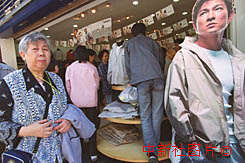 北京的名牌服装专卖店在门口打出香港影视歌三栖明星刘德华的巨幅照片,以吸引更多的顾客。中新社记者 张勤 摄