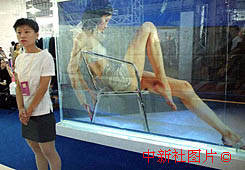 在中国各地举办的服装服饰展示会上,越来越多的服装厂家采用各种新颖的形式进行商业促销。图为江苏服装博览会现场,一厂商用真模特做广告宣传内衣。中新社记者 钱兴强 摄