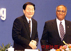 中国国务院总理朱镕基和非洲统一组织秘书长萨利姆(右),12日在北京出席“中非论坛——北京2000年部长级会议”闭幕式。中新社记者 满会乔 摄