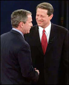 图文:戈尔及布什第三轮电视辩论开始 2000年10月18日 10:02 ![]() 戈尔与小布什礼节性握手 中新网华盛顿10月18日消息:距离美国总统大选头偏只剩下3星期。民主和共和两党候选人戈尔及乔治布什,于北京时间今早9时展开第三轮电视辩论。这也是选举前最后一次辩论,尽力争取仍未作出决定的选民支持。 电视辩论在华盛顿大学举行,历时90分钟。在开始辩论前,主持人宣布为刚在空难中丧生的密苏里州州长卡纳翰默哀。两人将会在今天辩论中,集中讨论外交问题。(图文均据外电) 相关报道:戈尔和小布什今天进行最后一场电视辩论 相关报道:调查显示小布什第二轮电视辩论表现佳 相关报道:民调显示戈尔、布什首次电视辩论未见明显输赢 |