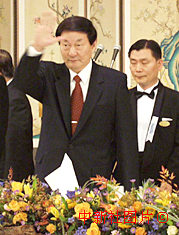 中国总理朱镕基18日在韩国经济四团体举行的午餐会上向韩国经济界的来宾挥手致意。中新社记者 王晓晖 摄