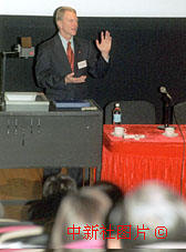 ‘曾三次执行太空穿梭机特别飞行任务的美国太空人尼尔逊博士,十月二十一日在香港科学馆举行的“二十一世纪科学及科技教育透视”研讨会上作演讲。中新社传真 任海霞摄