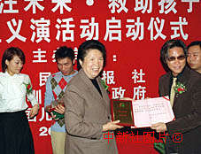 香港演艺界明星许志安、苏永康、容祖儿,二十六日在北京人民大会堂中国儿童少年安康成长计划工作委员会成立暨“关注未来·救助孩子”大型义演活动启动仪式上捐赠签名光盘,并被授予爱心大使称号。中新社记者 李刚 摄