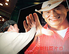 国际影视巨星成龙的照片深受影迷的喜爱,图为北京一影迷和成龙的照片“击掌”以拍照留念。中新社记者 张勤 摄