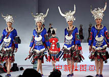 大型服饰晚会“聚焦绿城.2000”十九日晚在广西南宁市体育馆举行,集中展示了中国少数民族服饰作品。 图为浑身银色装饰的苗族作品。中新社记者 钱兴强 摄