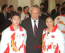 香港特首董建华27日在香港礼宾府会见中国奥运金牌运动员时与体操冠军刘璇、李小鹏合照。中新社传真 邓庆乐 摄