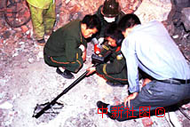 东莞厚街一幢擅自施工的私人建筑物一日晚发生倒塌,造成八人死亡,四十余人受伤,一百多人失踪。图为警方动用最先进的生命探测仪搜寻被埋者。作者:潘劲松