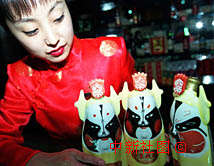 北京老舍茶馆的服务小姐正在向戏迷推销一种包装独特的“戏酒”。这种绘有京剧脸谱的瓶装酒,在元旦节前一上市就受到戏迷们的青睐。中新社记者 张勤 摄