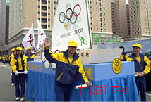 澳门回归一周年到来之际,大丰银行职工推着有支持北京申办奥运标志的彩车在街头游行。中新社传真 宗金柱 摄