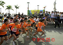 澳门回归一周年到来之际,澳门中华总商会青年委员会十七日举行一系列庆祝活动,图为在观音像前举办的环湖长跑比赛。中新社传真 宗金柱摄
