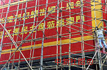 欢迎江泽民标语出现澳门 。15日,欢迎江泽民莅临澳门的标语出现在中央人民政府驻澳联络办门前,工人抓紧时间油漆标语。中新社记者满会乔摄