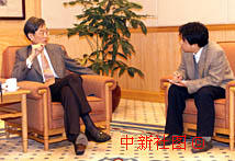 澳门回归一周年前夕,中新社记者陈立宇(右)17日在澳门专访外交部驻澳门特区特派员原焘。中新社传真 满会乔 摄