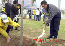 何厚铧为回归一周年植树(横片)。为庆祝澳门回归一周年,特区行政长官何厚铧十七日在莲花广场附近种下一棵纪念树。中新社传真 宗金柱摄
