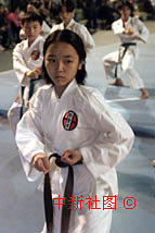 澳门体育界庆祝澳门回归祖国一周年表演晚会17日晚在塔石球场举行。澳门空手道总会的小运动员表演精彩。中新社记者满会乔摄